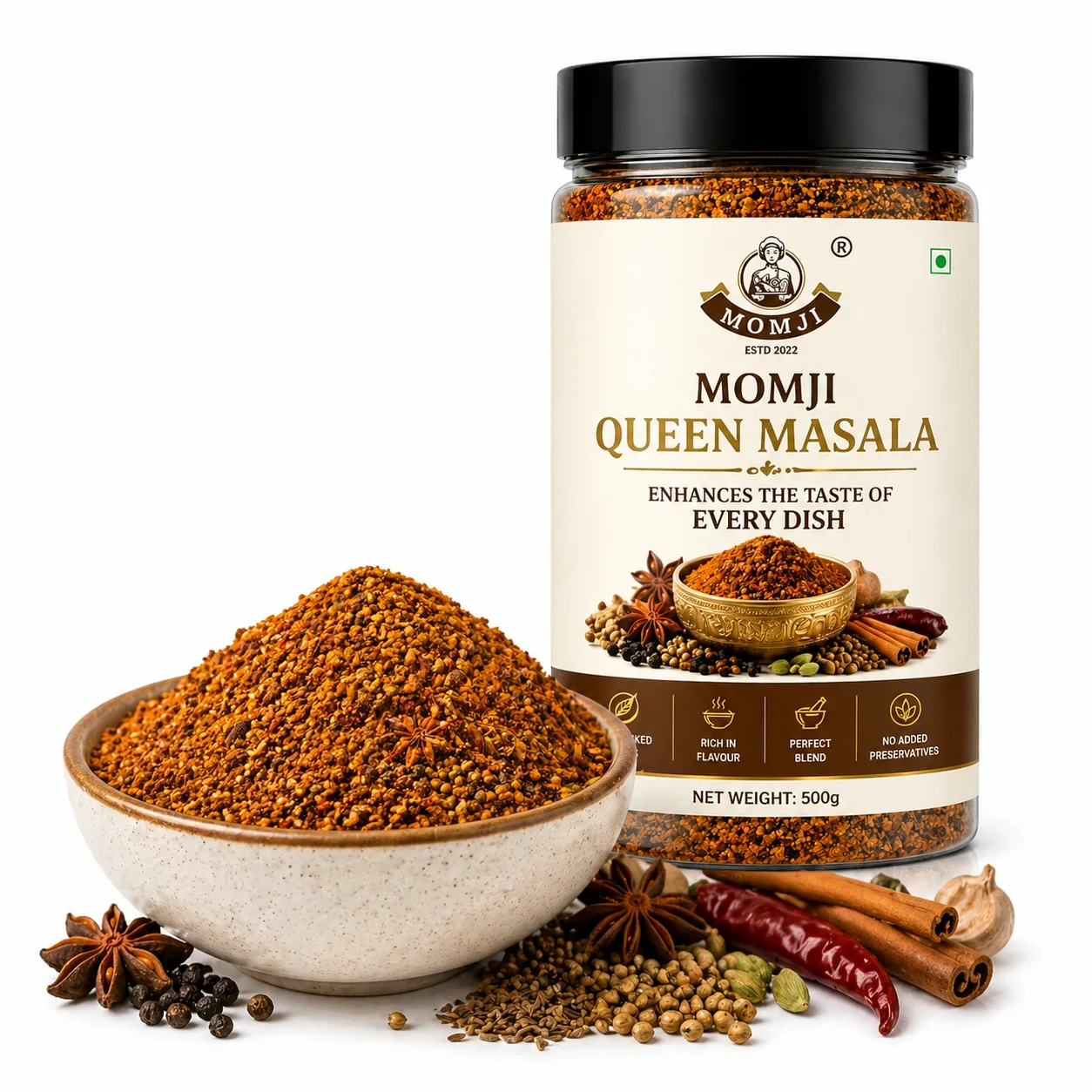 Momji Queen Masala is a refined blend of aromatic spices created to elevate the taste of every dish. Designed for versatility, it adds depth, richness, and a perfectly balanced flavor to your daily meals—making every bite more flavorful and satisfying.